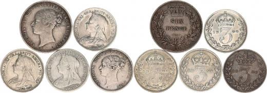 6 Pence 1871, pod stuhou číslo 46 - var. vroubk. hrana 3 Pence 1886, 1896, 1900(2x) 5 ks