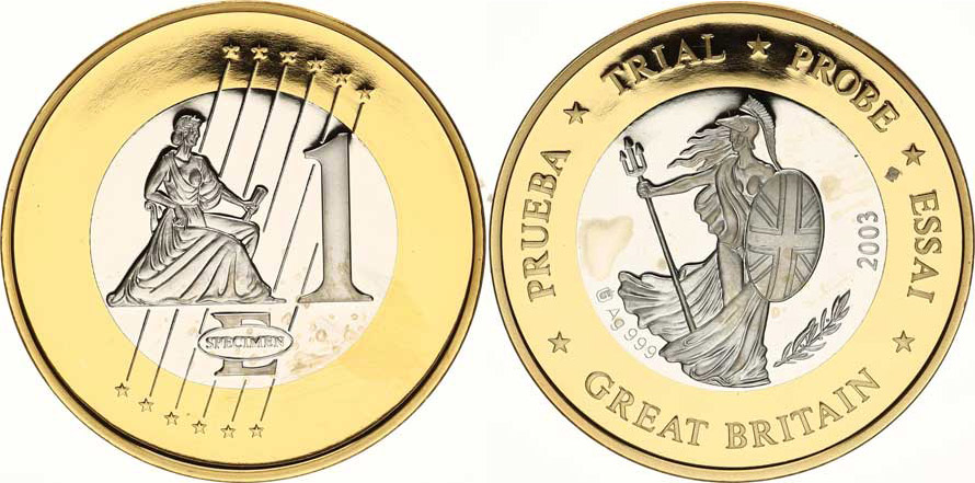 1 Euro 2003 - stoj. Britannia s trojzubcem "SPECIMEN" bimetal Ag 999 25 g N. 210474 kapsle