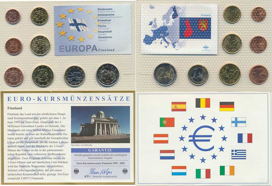 Sběratelská sada EURO mincí 1999-2002 (1, 2, 5, 10, 20, 50 Cents, 1, 2 Euro) 8 ks adjustace +certifikát BTN