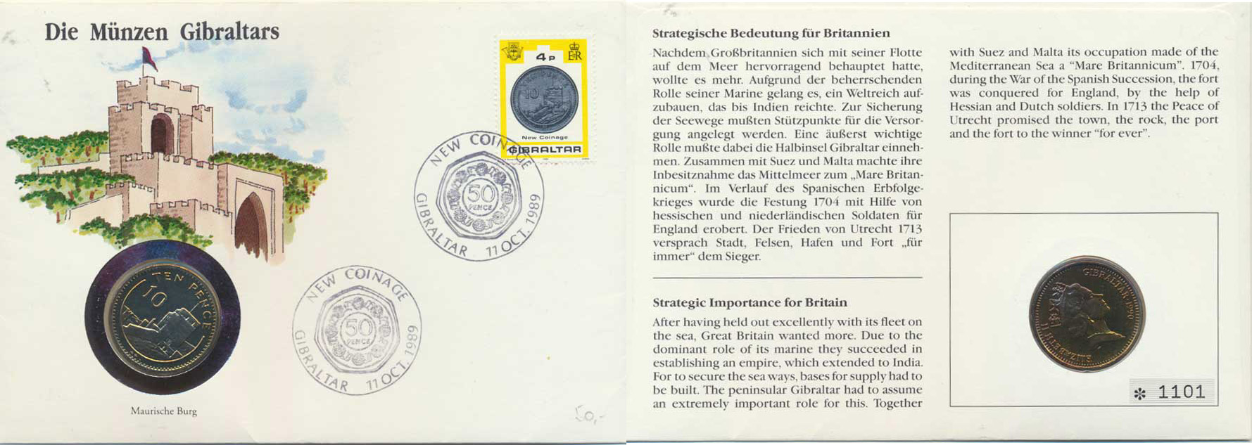 10 Pence 1990 PM AA "Mincovní dopis", grafická obálka se známk ou +2 razítka Gibraltar New Coinage 11.Oct. 1989 číslo obáky *1101