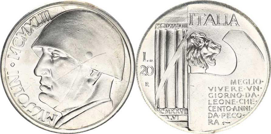 20 Lire 1928 rok VI - Mussolini KM 69 "sběratelská kopie" stříbřený kov 15,933 g