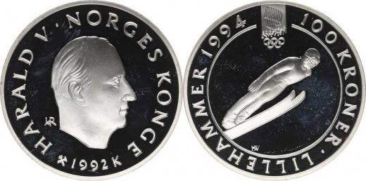 100 Kroner 1992 K - OH 1994 Lillehammer, skoky na lyžích KM 440 Ag 925 33,62 g kapsle