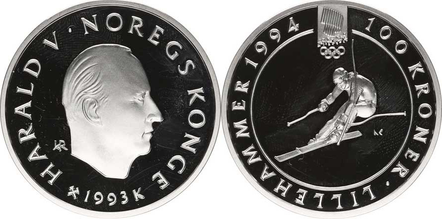 100 Kroner 1993 K - OH 1994 Lillehammer, slalom KM 450 Ag 925 33,62 g kapsle