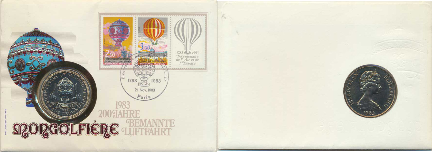 1 Crown 1983 - 200. výr. letu s posádkou KM 105 CuNi jako "Mincovní dopis" grafická obálka +dvě známky s razítkem Paris 21 Nov. 1983