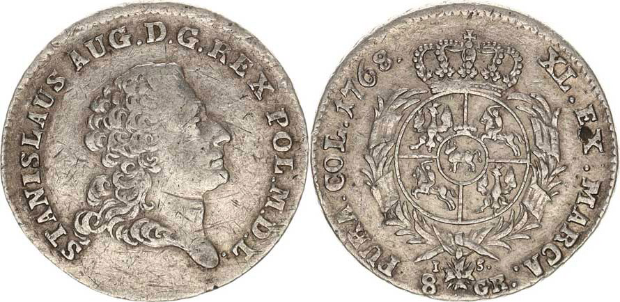Dwuzłotówka (8 groszy) 1768 IS, Varšava "R" 8,588 g Kopicki 2391; Parchimowicz (SAP) 24.c6; Plage 315