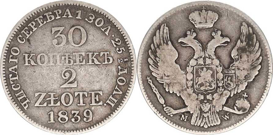 2 Zlote - 30 kopějek 1839 MW Cr.132; Kop.859