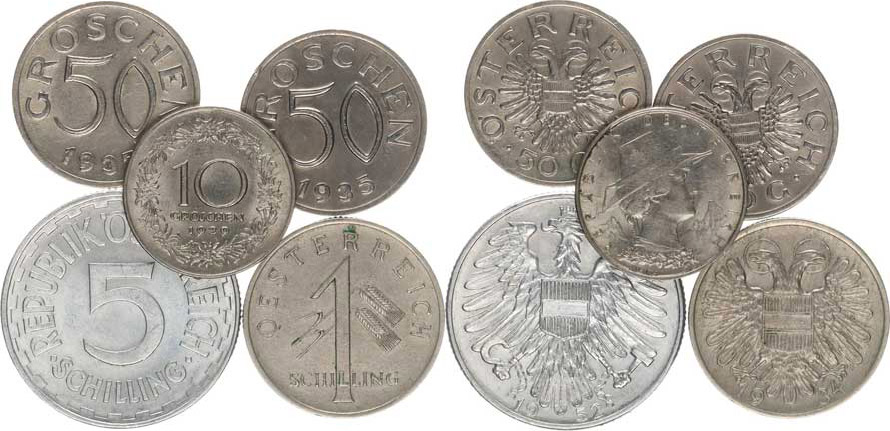 10 Groschen 1929, 50 Groschen 1935(2x), 1 Schilling 1934, 5 Schil ling 1952 5 ks