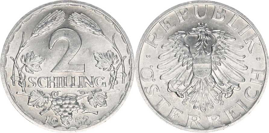 2 Schilling 1952 KM 2872; Schön 71 "RR" (pouze 14 9 000 ks !)