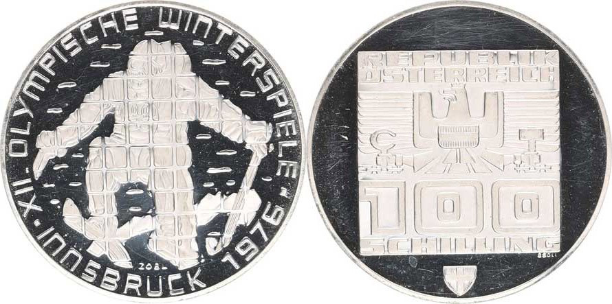 100 Schilling 1974 - OH Insbruck 1976, lyžař minc. Vídeň KM 2928 kapsle
