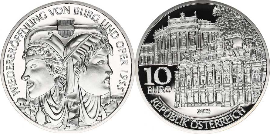 10 Euro 2005 - 50. výročí Vídeňské opery KM 3125 kapsle , orig. etue +certifikát (Ag 925 17,30 g)