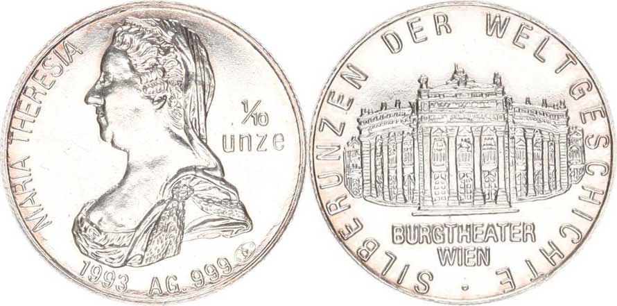 1/10 unce Ag 1993 - Marie Terezie / Burgtheater 22 mm 3,10 g