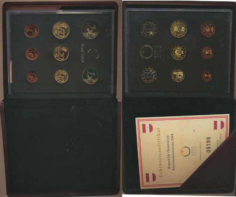 Ročníková sada 2004 (1,2,5,10,20,50 Cent, 1,2 Euro) - orig. balen í v koženkovém obalu peněženkového typu +certifikát č. 08256 (vy d. 20000 sad)