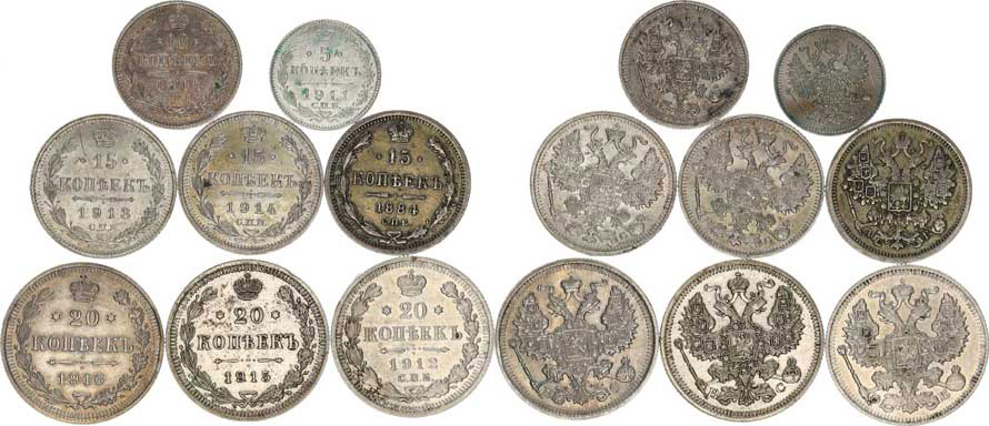 5 Kop. 1911 EB (Ag); +10 Kop. 1914 BC; +15 Kop. 1884 AG, 1913 BC, 1914 BC; +20 Kop. 1912 EB, 1915 BC, 1916 BC / vše SPB Ag 8 ks