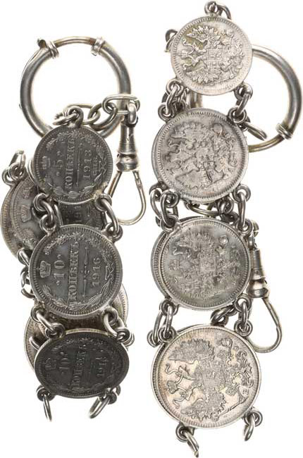 Náramek 255 mm dlouhý zhotoven z 8 ks pospojovaných 5, 10, 15 kopějek Mikuláše II. "pěkná práce"_funkční