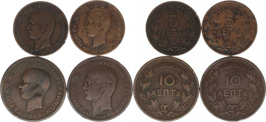 10 Lepta 1869 BB, 1882 A; +5 Lepta 1869 BB, 1882 A 4 ks