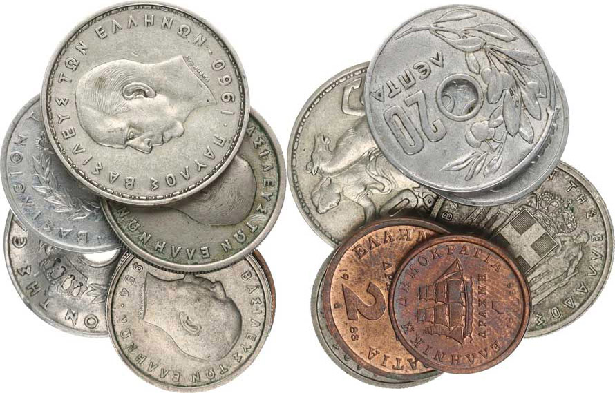10, 20 Lepta 1, 2 Drachmai 1954; +1, 2 Drachmai 1988; +20 Drachma i 1960 7 ks