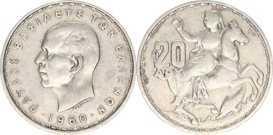 20 Drachmai 1960 KM 85 Ag 835 7,5 g