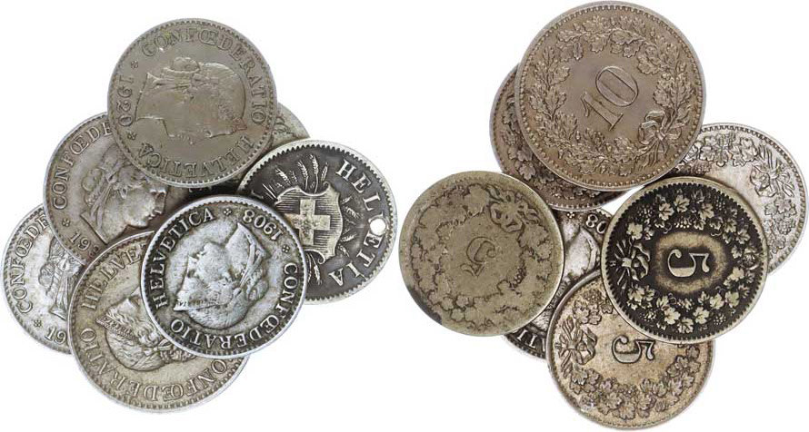 5 Rappen 1850 BB (-3/4), 1873 B (dírka), 1908 B, 1909 B, 1920 B, 1930 B; +10 Rappen 1884 B 7 ks