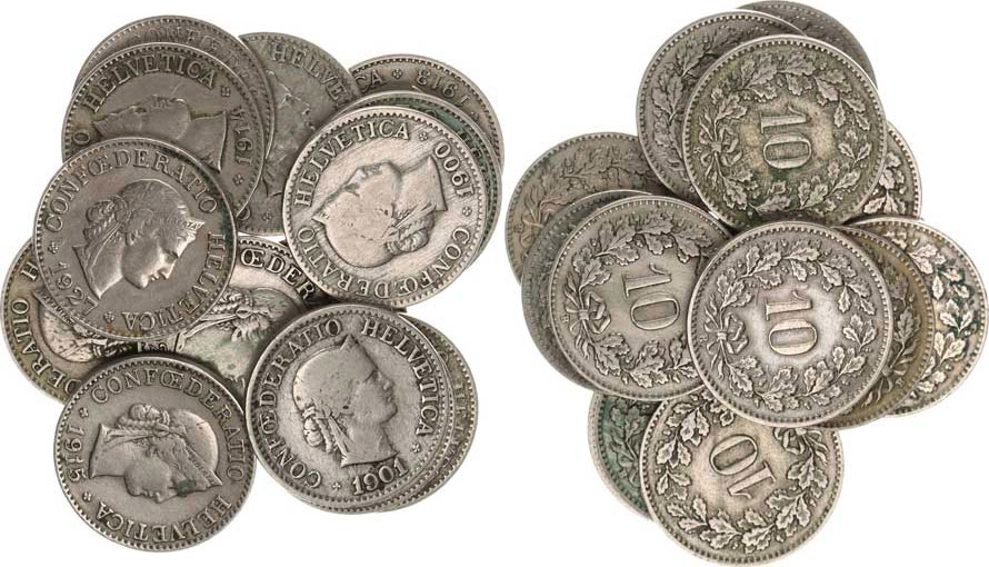 10 Rappen 1900(2x), 1901, 1902, 1908, 1913, 1914(2x), 1915, 1921, 1925, 1927, 1928, 1929 vše B 14 ks