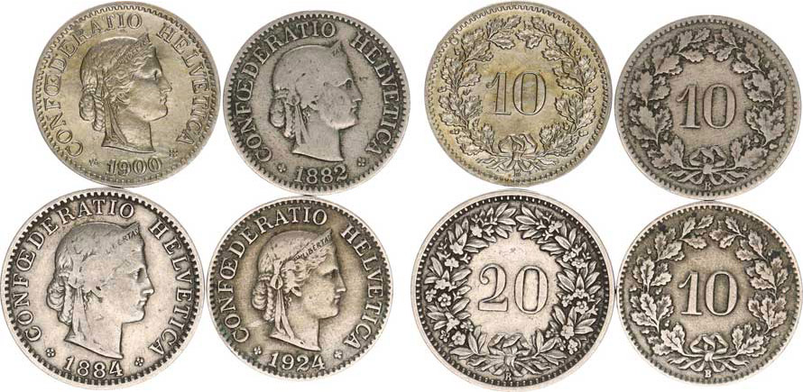 20 Rappen 1884 B; +10 Rappen 1882, 1900, 1925 vše B 4 ks