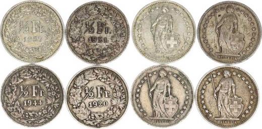 1/2 Francs 1920, 1921, 1944, 1957 vše B 4 ks