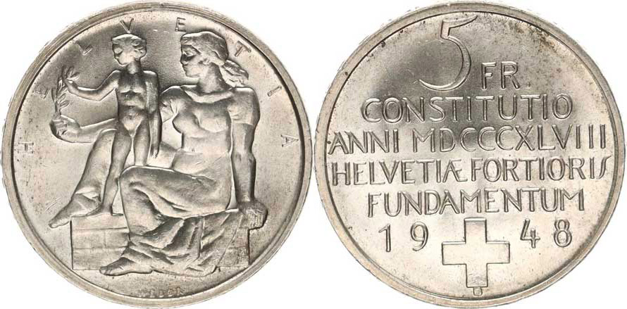 5 Francs 1948 B - 100. výročí konstituce KM 48 Ag 835 15,00 g