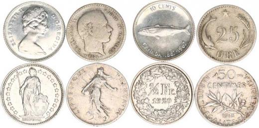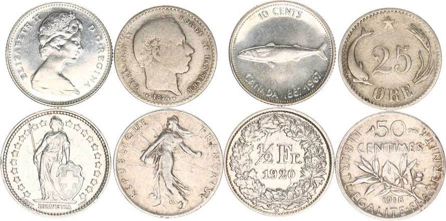 4 ks: Dánsko 25 öre 1874, Francie 50 cent. 1918, Švýcarsko 1/2 fr anc 1920 B, Kanada 10 cents 1967 - jubil.
