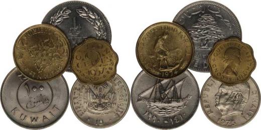 20 Chetrums 1974 - F.A.O.; +Ceylon - 2 Cents 1957; +Kuwait - 100 Fils 1990; +Haiti - 10 Cents 1975; +Libanon - 1 Livre 1981 5 ks