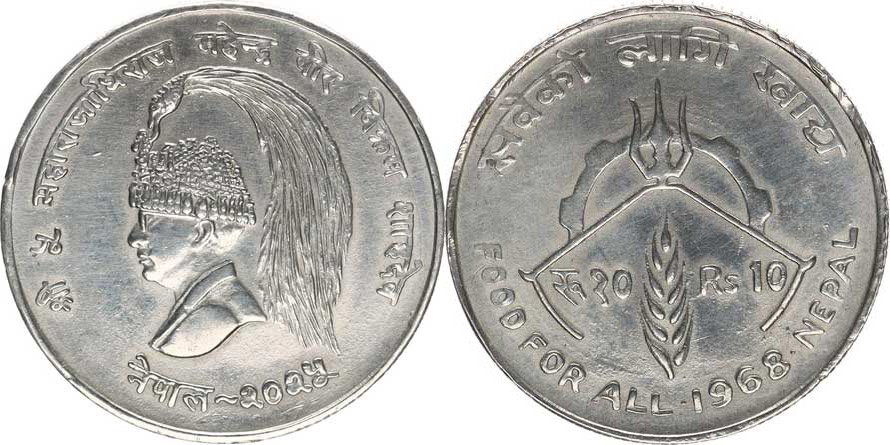 10 Rupees VS 2025 (1968) - Bir Bikram / F.A.O. KM 794 Ag 600 15,6 g_dr. hr. ražbou
