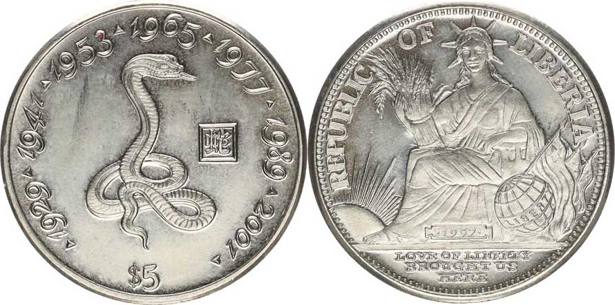 5 Dollars 1997 - Čínský kalendář - had / socha Svobody KM 356 CuNi