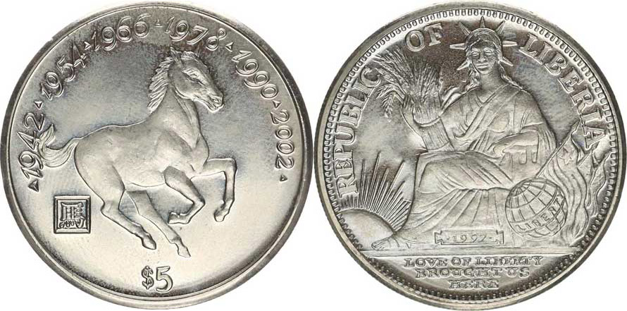 5 Dollars 1997 - Čínský kalendář -kůň / socha Svobody KM 357 CuNi