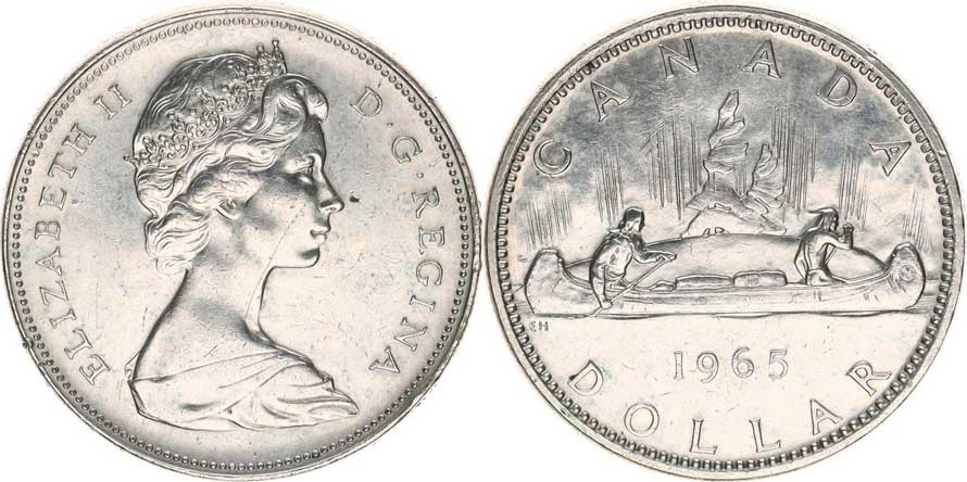 1 Dollar 1965 - kanoe KM 64,1 var. šikmý konec č. 5 v data ci, velké tečky po obvodu Ag 800 23,33 g_dr. rys.
