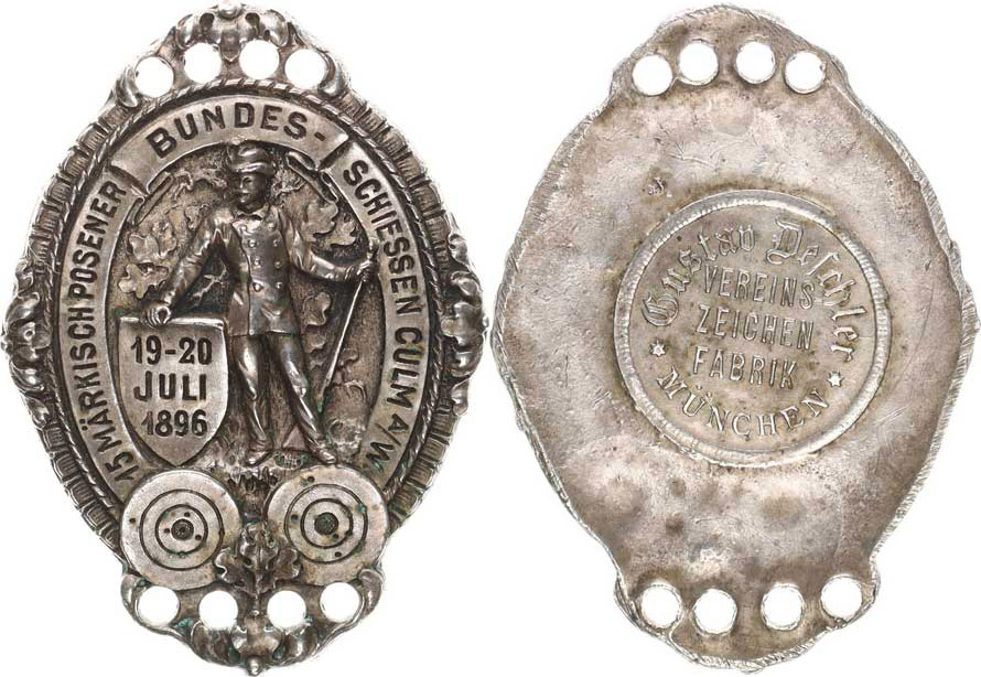 Culm (Chmelno) - 15. Märkisch Posener Bundes-Schützen 19-20. Juli 1896, Stojícá střelec drží v levé ruce pušku a v levé terč s nápi sem / výrobce: Gustav Defchler München ovál. bílý kov 35,5x50 mm
