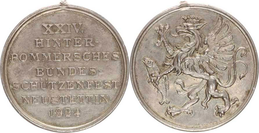 Neustettin (Nový Štětín) - XXIV. Hinter-Pommersches Bundes Schütz en 1924, 8-mi řádk. nápis / Kráčející korunovaný lev zleva s rybo u v pařátu Ag 26,2 mm 8,301 g