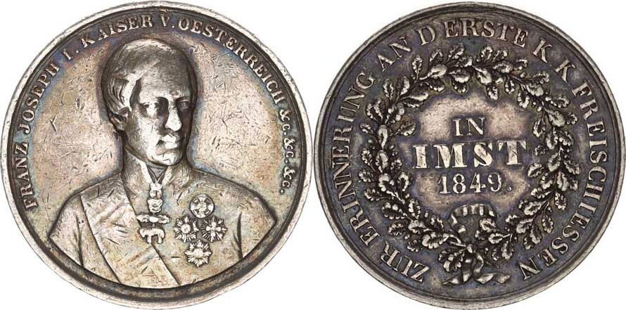 Imst - Na památku první C. k. střelby v r. 1849, opis a v dubovém věnci 3-řádk. nápis / Polopostava F.J.I. mírně zprava, opis Ag 41 mm (25,376 g) Taul -, Hauser -, Morosini -, Rauch – Aukce 91 (2012) pol. 5 "RR"