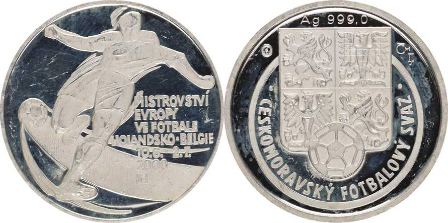 Českomoravský fotbalový svaz, znak / Mistrovství Evropy ve fotbal e Holandsko-Belgie 10.6 2.7. 2000, střílející hráč Ag 999 34 mm 16,247 g