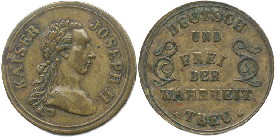 Sudety - Žeton německého spolku s portrétem Josefa II. (kolem r. 1900) / Šestiřádkový německý nápis: DEUTSCH / UND / FREI / DER / WARHEIT / TREU mosaz 24 mm