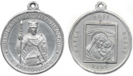 Křečovice - Mariánská družina jinochú b.l. Av.: Poloviční postava sv. Václava, opis / Milostný obraz Panny Marie z Genazzana MATKA BOŽÍ DOBRÉ RADY, opis Al 31 mm orig. ouško Přibil 144