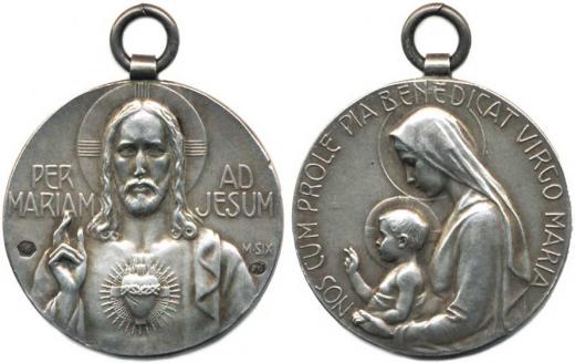 Praha 1 Staré Město - Mariánská kongregace při klášteře Služek Kr istových v Jámě. Av.: Panna Maria, před ní žehnající Ježíšek, opi s / Božské srdce Páně, PER / MARIAM - AD / JESUM sign.: MSIX Ag punc 900/1000 26 mm 9,46 g orig. ouško jako Přibil 440(Ag neuvádí !)