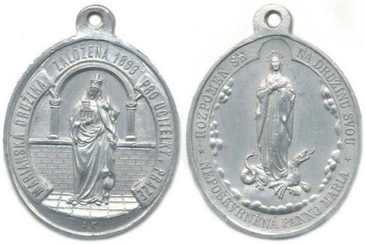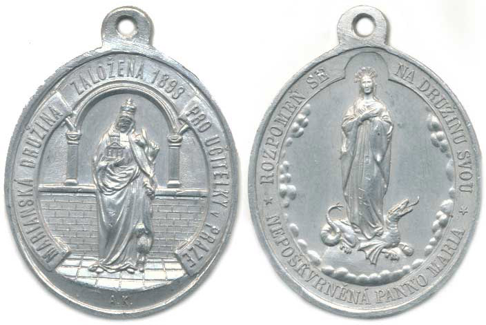 Praha 2 Nové Město - Mariánská družina pro učitelky u kostela sv. Ignáce s Jezuitskou rezidencí, Ječná ul. a Karlovo nám. Av.: Sto jící sv. Anežka, opis / Panna Maria Immaculata, opis sign.: A.K. (Alois Kettner) Al 29x34 mm orig. ouško Přibil 421