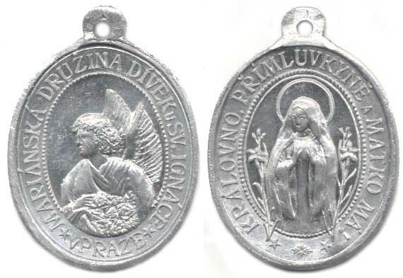 Praha 2 Nové Město - Mariánská družina dívek u kostela sv. Ignáce s Jezuitskou rezidencí, Ječná ul. a Karlovo nám.. Av.: Poprsí an děla s yr´ticí růží, opis / Panna Maria mezi dvěma liliemi drží oběma rukama na prssou srdce, opis Al 23x28 mm orig. ouškoPřibil 426