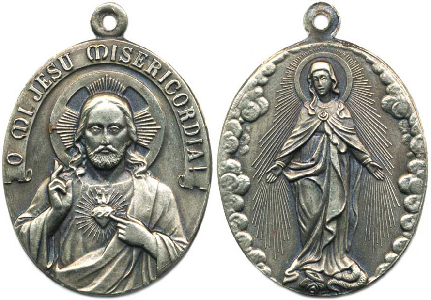 Praha 2 Nové Město - Medaile užívaná po I. světové válce Mariánsk ými družinami mužů i akademiků sdružených v Ústředí Mariánských d ružin u sv. Ignáce v Praze II.. Av.: Božské srdce Páně, opis / Panna Maria Immaculata stojí na hadovi a zeměkouli Alpaka 26x32 mm orig. ouško Přibil 428