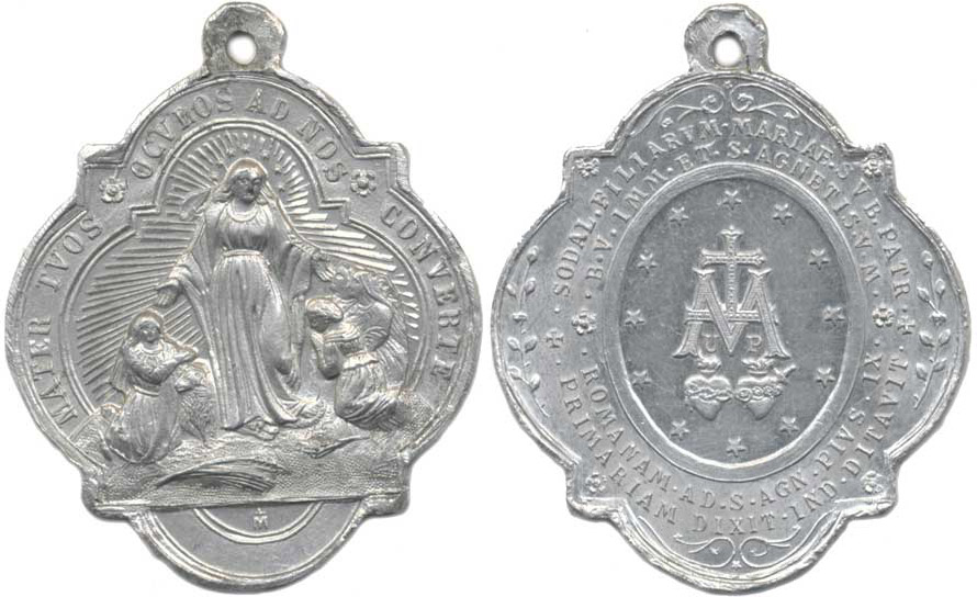 Praha 2 Nové Město - Ústředí Mariánských družin u sv. Ignáce s Je zuitskou rezidencí, Ječná ul. a Karlovo nám., Odznak členky (sodá lky) Dcer Mariiných. Av.: Stojící Panna Maria Immaculata, u její pravé ruky klečí sv. Anežka s beránkem, u levé pět dětí, opis / Mariánský monogram, opisy Al 34,5x38 mm ouško jako Přibil 432