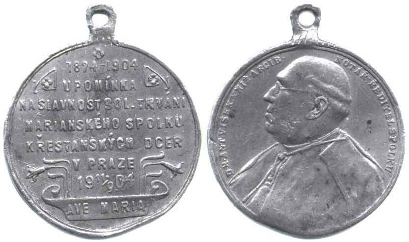 Praha 2 Nové Město - Mariánský spolek křesťanských dcer u kostela sv. Jana Nepomuckého na Skalce. Upomínka na slavnost 30 let trván í spolku 1874-1904. Av.: Osmiřádkový náps / Poprsí zleva, opis:DR. ANT. VÍŠEK. KNÍŽ. ARCIB. NOTÁŘ. ŘEDITEL SPOLKU Sn 34 mm orig. ouško Přibil 454