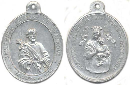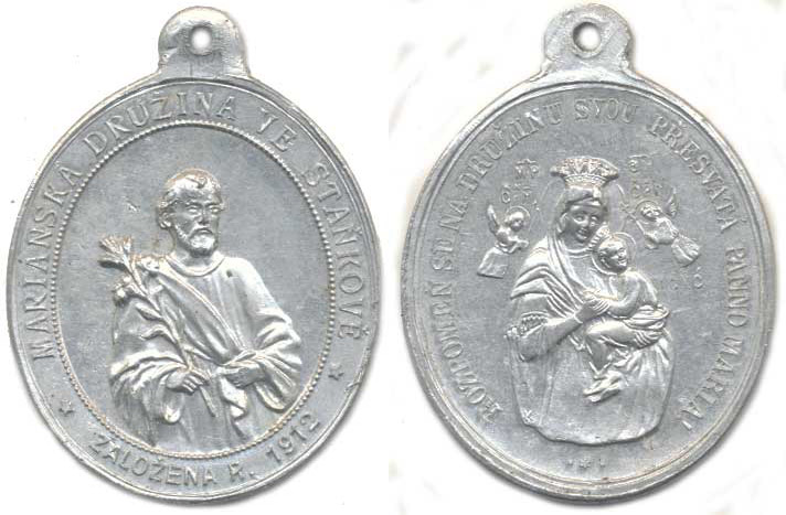 Staňkov (okr. Domažlice) - Mariánská družina založena 1912. Av.: Svatý Josef, postava do pasu, opis / Panna Maria Ustavičné pomoci , opis Al 29x34 mm Přibil 208 (uvádí pouze bronz !)