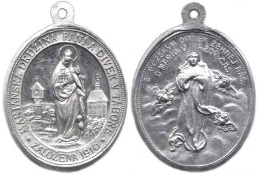 Tábor - Mariánská družina paní a dívek zal. 1910. Av.: Stojící sv . Anežka, u nohou beránek, opis / Panna Maria Assumpta v oblacích na půlměsíci Al 29x34 mm orig. ouško Přibil 361