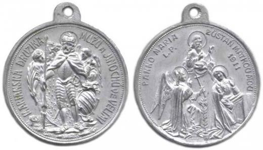Velim - Mariánská družina mužů a jinochů 1911. Av.: Stojící sv. Václav v brnění drží praporec a štít, opis / Výjev Zvěstování Pan ně Mariii, opis sign.: A K (Kettner) Al 30 mm orig. ouško Přibil 365