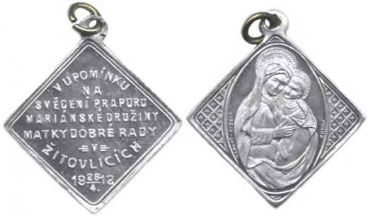 Žitovlice - Mariánská družina, svěcení praporu 28.4. 1912, Av.: O smiřádkový nápis / V oválu Panna Maria Matka dobré rady Al útes 35x35 mm ouško +bleděmodrá stužka Přibil neuvádí !