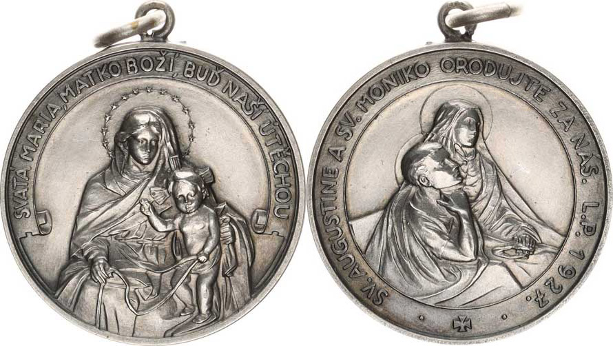 Augustiniáni - Sedící sv. Augustin zprava se svou matkou Monikou, opis / R: Sedící Panna Marie s Ježíškem, drží společně opasek, př edaný sv. Monice a augustiniánům, opis - datace 1927 alpaka 31,5 mm 12,693 g kulaté ouško +závěs