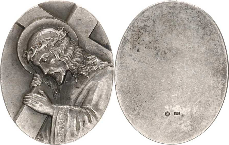 Pašijová medaile, Ježíš nese kříž sign.: O.P. Ag ovál 27x35 mm punc 987/1000 15,2 g